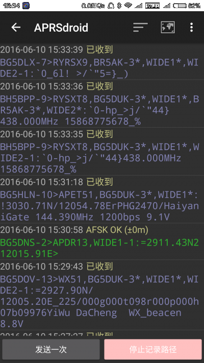 4, 日志界面,点“开始记录路径”,记得要先打开手机的GPS和APRS;显示收到周围台站的信标日志