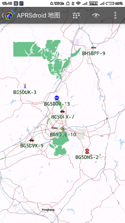 7, 在线设置完毕,可以上APRS.fi上查询(需要翻*墙):打开网页http://aprs.fi/#!addr=东阳市,“跟踪的呼号:”输入自己的呼号,比如输入“BG5DNS” 出来多个子站,-9就是APRSdroid发的,选-9,看到轨迹