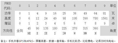 PHG 信息格式:由 3 个英文字符+4 个数字组成,其中“PHG”英文字符固定不变,后面的 4 个数字,分别表示电 台发射功率、天线高度、天线增益、天线指向, 比如:PHG1030。设置参考下表。?