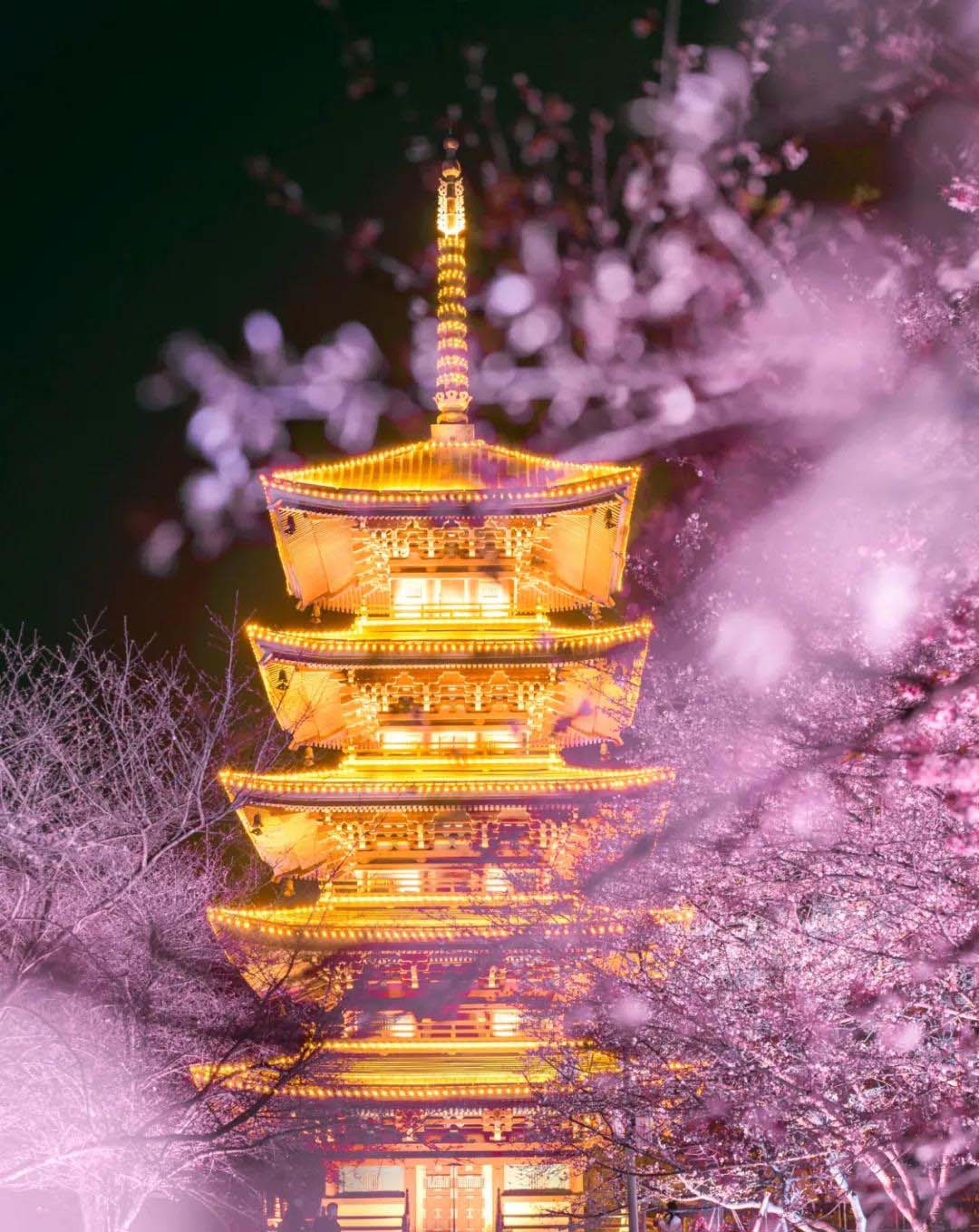 夜晚6点半,群灯初亮,金边勾勒出五重塔的恢弘模样,粉红花瓣在灯下盈盈发光,鎏金般的夜景,让人梦回盛唐。