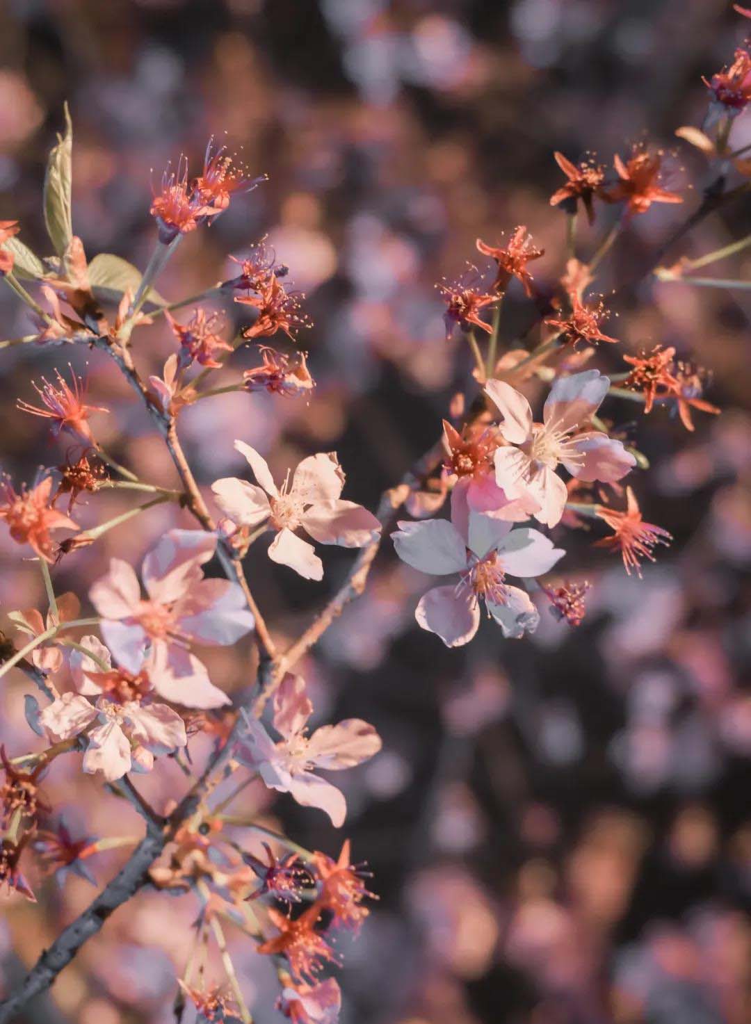 少去了熙攘的人流,樱花树伸展着枝条,花朵颜色深浅不一,神秘妩媚。